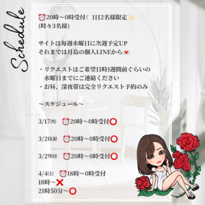 出勤予定♡ 2026/03/17 20:11:26 来月からはまた出れる日が少なくなりそうですができる限り!会える日作ります🥹3月、まだまだ会えますよ🥰 本日も0時までお待ちしてます🫶 X ▶ https://twitter.com/12_chanmika_12直お問い合わせ個人LINE▶ https://lin.ee/fwRhN5Xリットリンク▶https://lit.link/tsukishimachanmika月島みか🌹